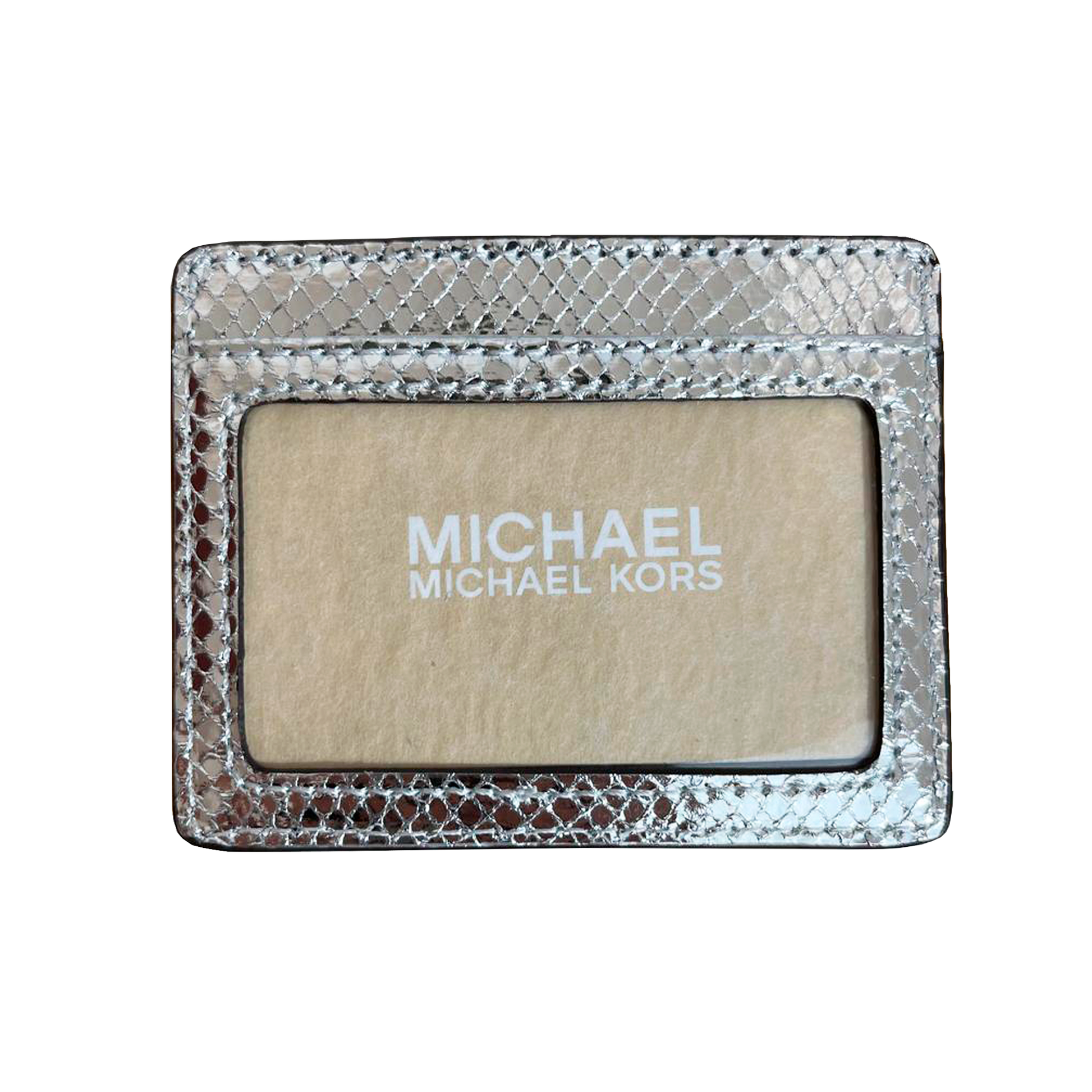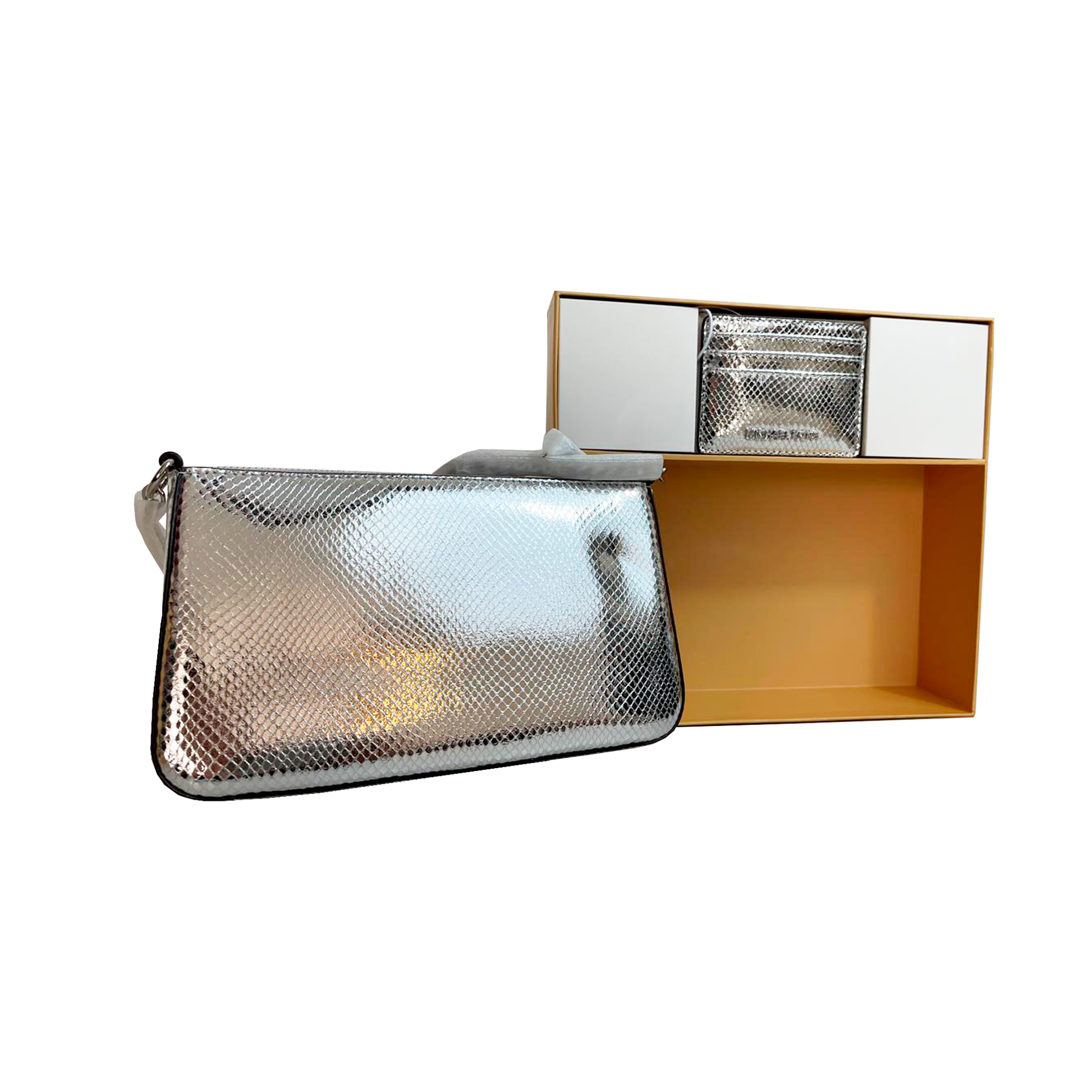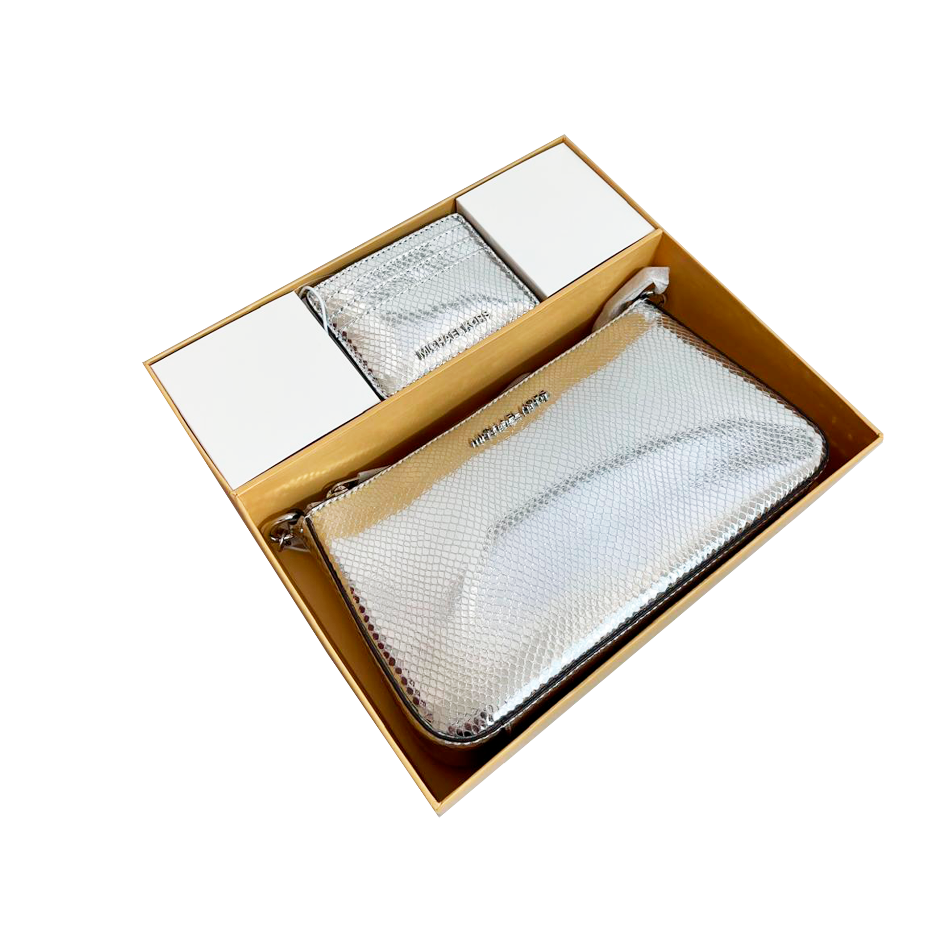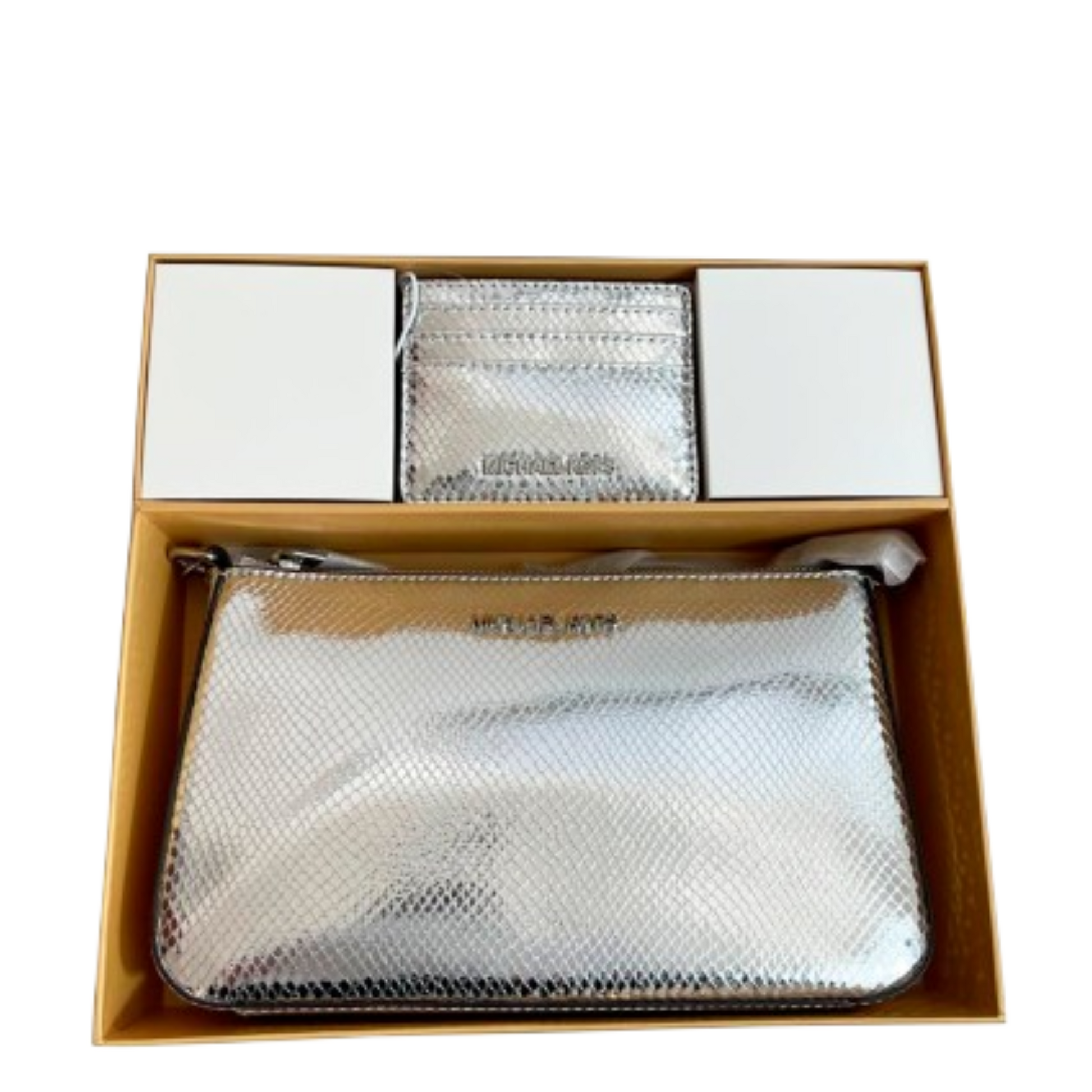 SET DE BOLSA Y TARJETERO EN CAJA DE REGALO MICHAEL KORS. MODELO: MEDIUM POUCH AND CARD CASE GIFT SET SILVER. 35F4SGZD6M. 197853083868. CON ETIQUETA Y MANUAL DE CUIDADOS